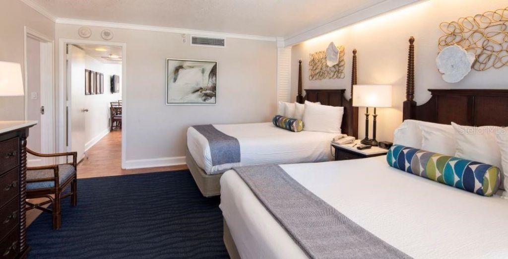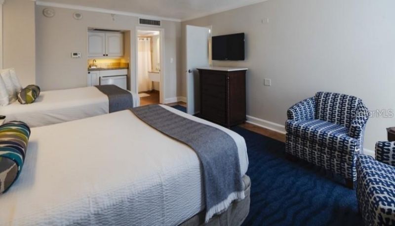 Admire and relax with the views of the lush tropical landscape from your 2nd floor balcony. This fully furnished, two bedroom, 2 bath, 835 sq. ft. condo-hotel residence makes it easy for everyone to relax and stretch their legs. There is Plenty of room with 2 queen beds in one bedroom, 2 double beds in the other bedroom along with a comfortable sleeper sofa in the additional living room area. Enjoy the kitchenette with full-size fridge, stove-top, microwave, coffee maker, toaster and dishware There is a huge extended deck area with additional sitting area just steps by your front entry door. Excellent total turn-key rental income from the first class management rental program is already in place. Stay up to 28 days a year. Existing rental management agreement with the Tradewinds resort transfers to buyer. The Tradewinds offers over 1000' of Sandy Gulf-Front Beach on over 40 acres that will have you feel as though you are in a Tropical Paradise. Seven pools, 10 food and beverage outlets, water slides, water activities, fitness facilities and tennis courts are just a few of the very many amenities. The Tradewinds has a long established track record with hosting many weddings and conventions. What an opportunity. Great for a 1031 exchange. This resort offers it all !